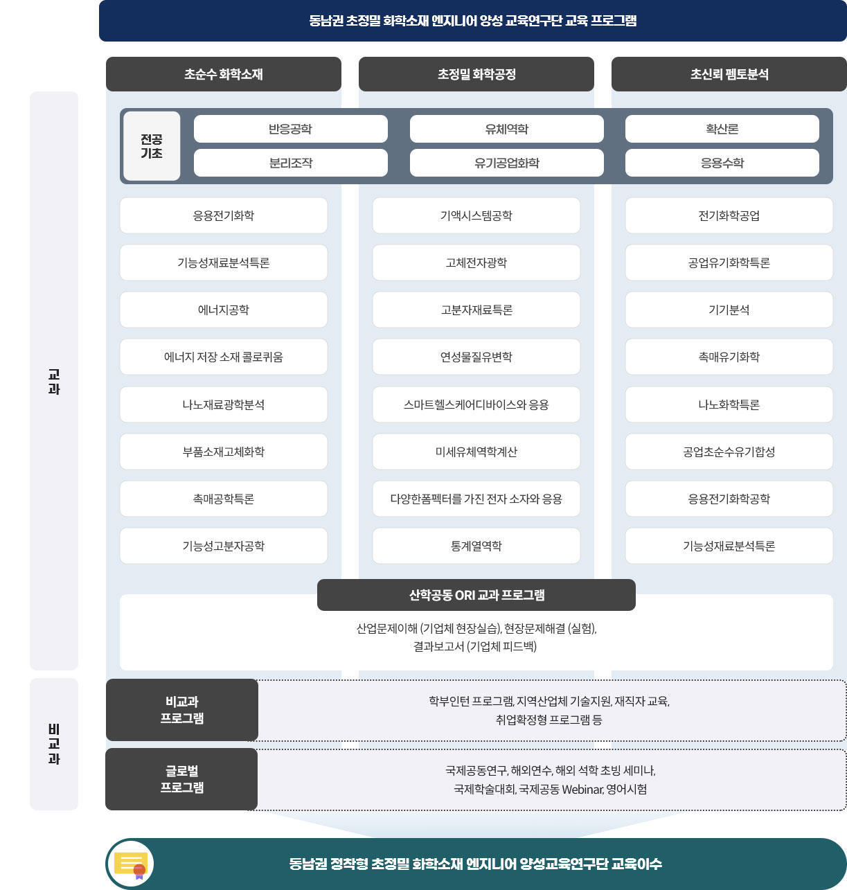 - 박사: 초정밀 화학소재 특성화 교과과정은 3S 특성화 교과목 24학점 이상 필수, ORI 교과목 6학점 필수, 연구학점 4학점을 포함해서 총 40학점 이수를 박사 졸업 전까지 만족해야 함